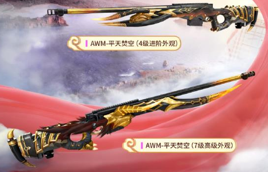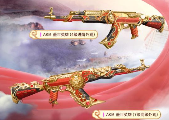 本次所给的联动皮肤有两种橡皮,分别为akm和awm。akm的联动皮肤叫做盖世英雄,一共分为7个等级,第1级的外观比较像黄金ak,整体呈现出金色状态。在枪托和枪板上有红色的装饰,第4级的外观就比第1级要多出很多细节和纹理了,第4级的枪有很多火云加持。第7级是最高等级,皮肤的主色调发生了变化,从金色改为红色色调,整个枪支上都有着红云的点缀。