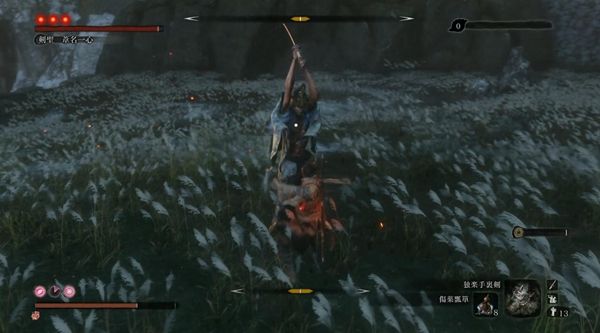 只狼和敌人的距离决定了敌人的攻击方式。近距离,是柄打开始的下段扫荡(危险攻击),中远距离就是敏锐的十文字斩。前者在居合准备动作的时候就可以进行攻击,柄打在格挡后进行跳跃攻击可以轻松制造攻击机会。